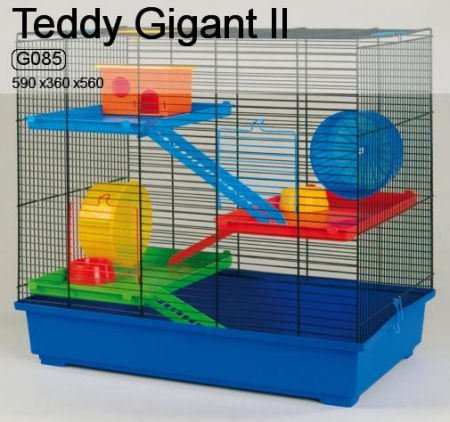 Klatka przeznaczona głównie dla chomika i drobnych gryzoni z pełnym wyposażeniem. Klatka wykonana jest z metalowych prętów pokrytych czarną, nietoksyczną farbą. Otwierana od góry, posiada 2 szt. drzwiczek z boku. Zabiegi higieniczne ułatwia głęboka, odpinana kuweta.