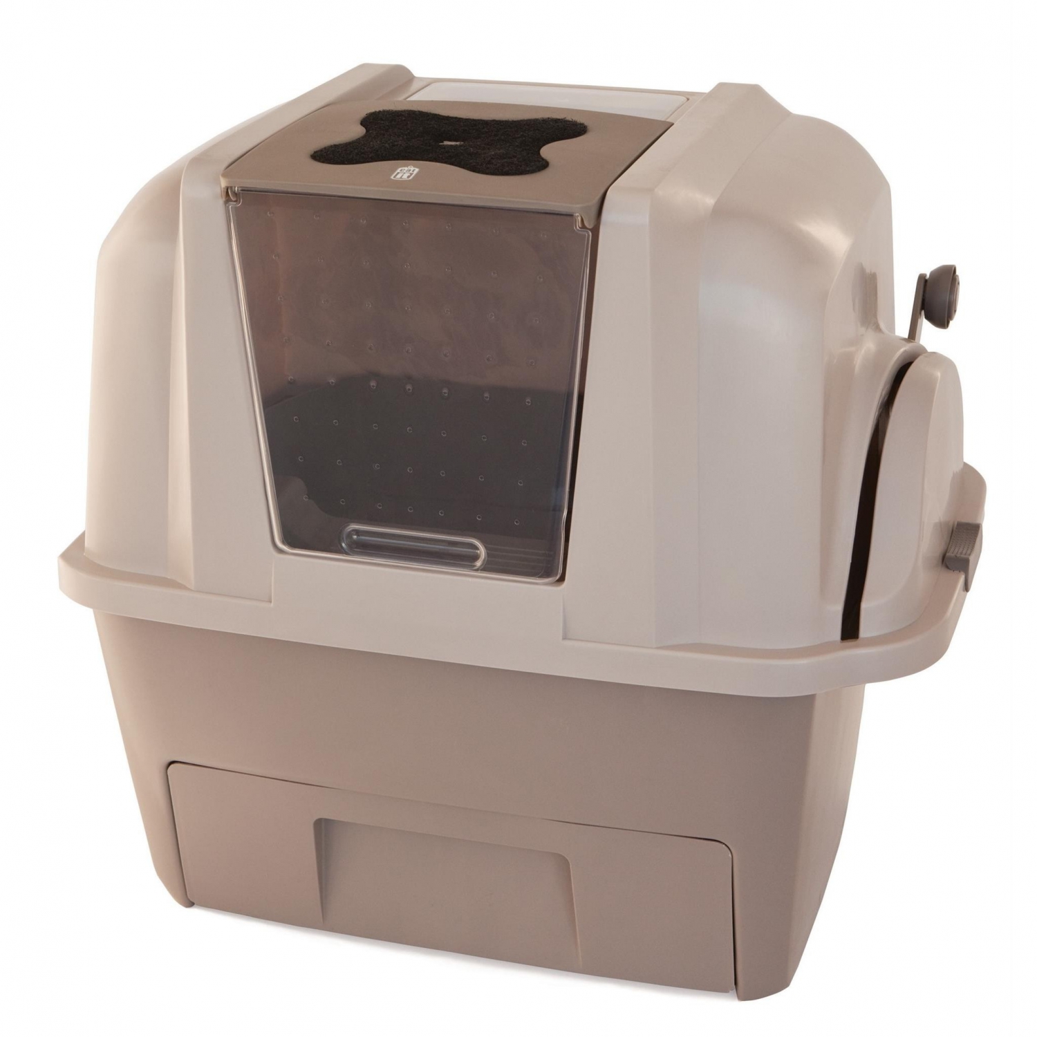 Kluczowe cechy: Bezpieczny i cichy proces Żadnych zmotoryzowanych części - żadnych drogich części do zastąpienia Uszczelniona konstrukcja minimalizuje śledzenie, zapewnia prywatność Zintegrowany filtr węglowy pochłania zapachy Duże wahadłowe drzwi pozwalają kotom łatwo wejść i wyjść Przejrzyste okno dostępu umożliwia łatwe monitorowanie ściółki Wyciągany kosz na śmieci zbiera kłaczki odpadów w celu ich łatwego usunięcia Drzwiczki dostępowe do konserwacji umożliwiają łatwe uzupełnianie śmieci Zawiera jedną biodegradowalną wkładkę do miski dla kota i jedną do wysuwanego kosza na śmieci Odpowiedni dla kotów wszystkich rozmiarów i żwirków