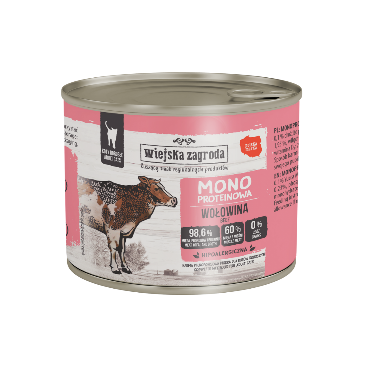 Poznajcie mono proteinowe karmy mokre Wiejska Zagroda dla kota. Każda puszka zawiera jeden rodzaj mięsa, które plasuje się na pierwszym miejscu każdego składu!