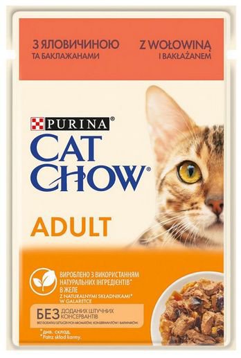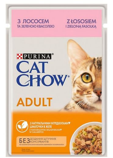 Purina® Cat Chow® Adult, delikatne kawałki w galaretce z łososiem i zieloną fasolką, kurczakiem, wołowiną lub jagnięciną.