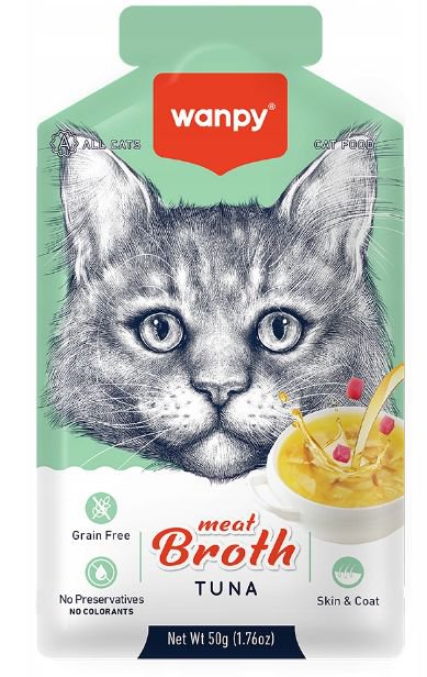 WANPY Cat Meat Broth Tuna to pyszna i aromatyczna zupa z kawałkami tuńczyka, stworzona specjalnie z myślą o kotach. Saszetka 50g to idealna porcja jako uzupełnienie codziennej diety – zarówno dla kotów dorosłych, jak i seniorów. Lekka, niskokaloryczna formuła na bazie naturalnych składników wspiera nawodnienie i dostarcza cennych składników odżywczych.