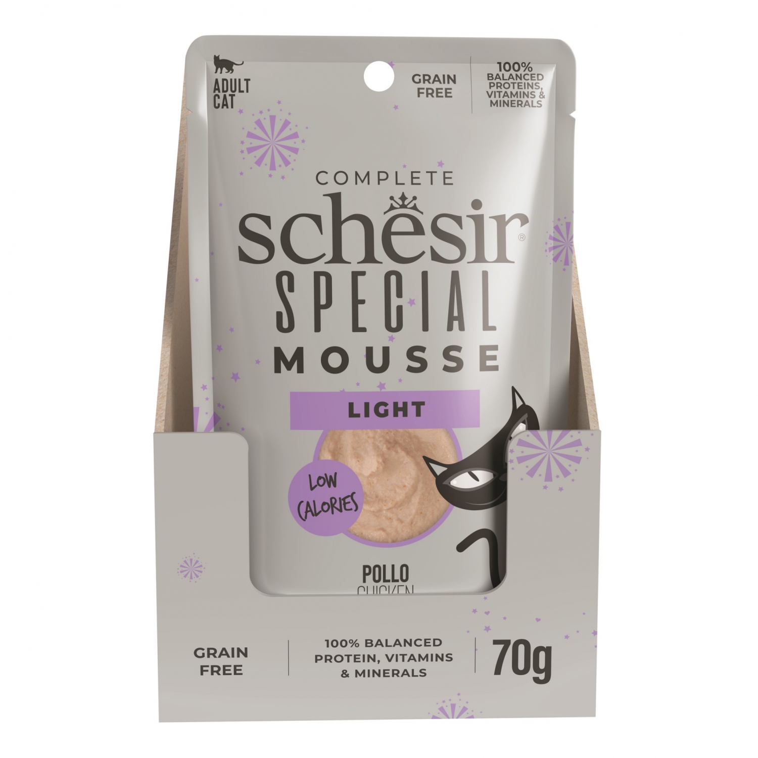 Kompletna karma dla dorosłych kotów z tendencją do nadwagi. Przepis specjalnie opracowany dla kotów z tendencją do nadwagi, z niższym spożyciem kalorii niż inne musy Schesir dla dorosłych kotów; oparty na prawdziwym mięsie kurczaka z dodatkiem indyka, zmiksowanym w miękkim, aksamitnym musie.