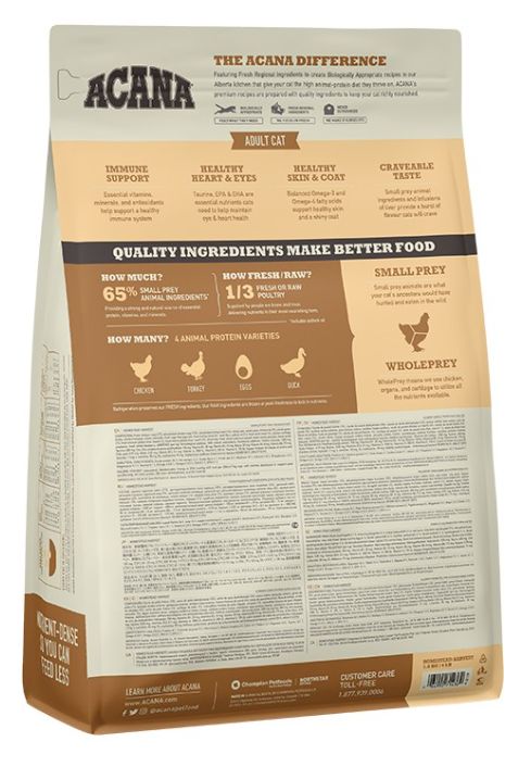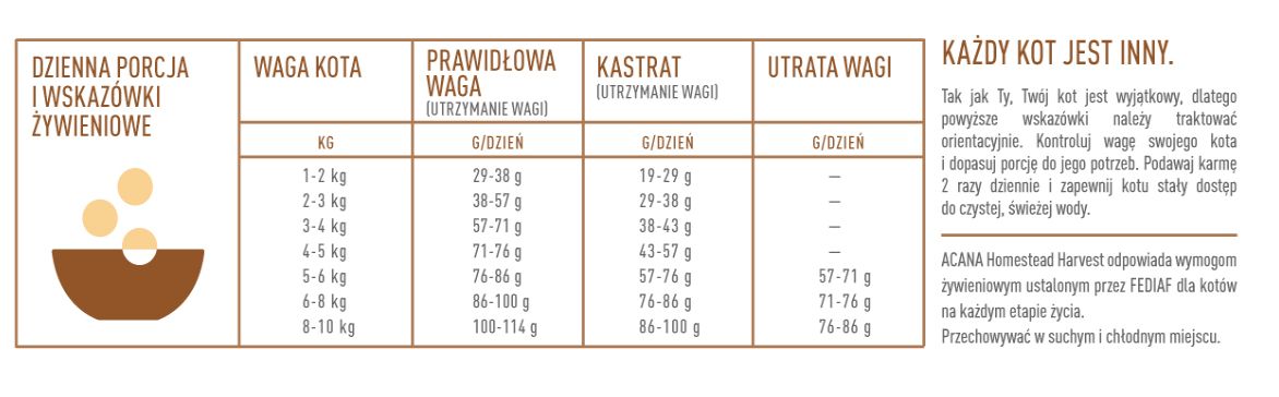 Acana Homestead Harvest Cat 65% zawartości składników zwierzęcych małych gatunków w proporcjach WholePrey
