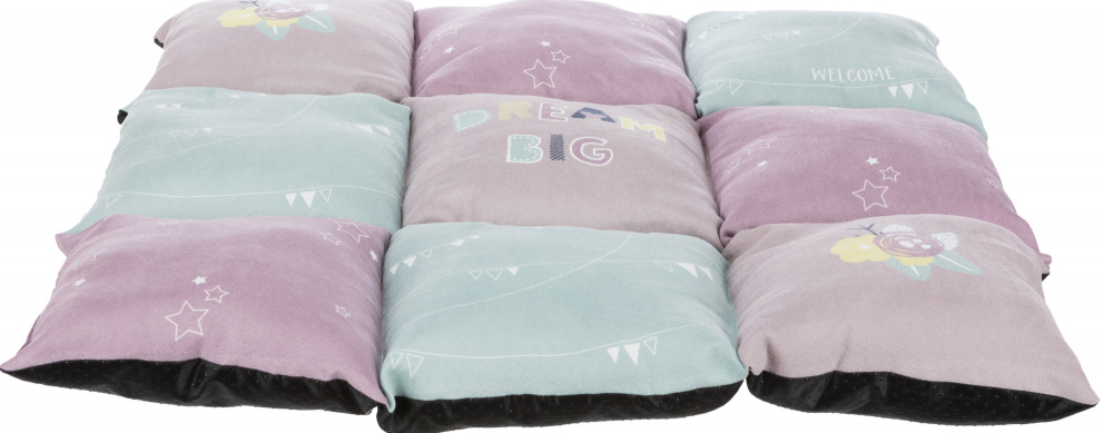 Miękkie legowisko dla psa wykonane techniką patchwork. Wierzch kocyka został uszyty z przyjemnego w dotyku materiału, natomiast spód pokryto specjalną powłoką zapobiegającą poślizgom. Kocyk stanie się ulubionym miejscem odpoczynku psa w domu, a dzięki temu, że po zwinięciu w rulon nie zajmuje dużo miejsca, można zabrać go ze sobą w podróż. Posłanie można prać ręcznie.