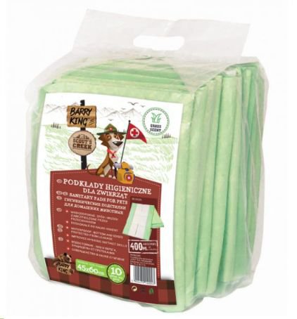 Super chłonne podkłady dla psów, doskonale zatrzymują wilgoć. Zielone podkłady higieniczne o zapachu trawy i wymiarach 45 x 60 cm to rozwiązanie problemu, gdy Twoje zwierze ma kłopot z trzymaniem moczu lub gdy kot odmawia korzystania z kuwety. Świetnie sprawdzają się również podczas nauki czystości szczeniąt. Produkt wykonany z naturalnej celulozy o długich włóknach. Spód oraz krawędzie podkładu wykonane są z folii nieprzepuszczającej wilgoci. Idealnie sprawdzają się jako podłoże do legowisk dla ciężarnych psów i kotów oraz po zabiegach kastracji i sterylizacji. Pomagają utrzymać porządek w domu przy szczeniakach i młodych kotach. Ilość w opakowaniu 10 sztuk.