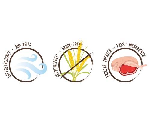 Świeży kurczak (69,5%), świeża jagnięcina (15%), produkty pochodzenia roślinnego, jabłka (suszone, 1%), czarny bez (suszone, 1%).
