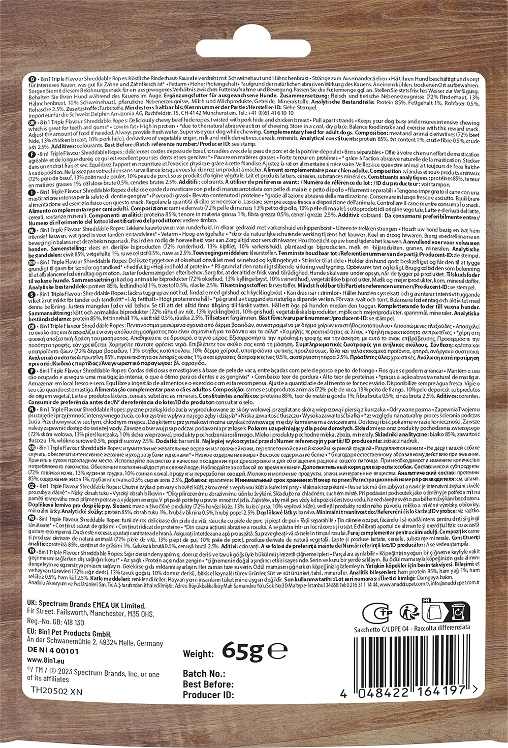 8IN1 Triple Flavour Ropes: pyszne przekąski do żucia wyprodukowane ze skóry wołowej, przeplatane skórą wieprzową i piersią z kurczaka. Odrywane pasma. Zapewnia Twojemu psu zajęcie i przyjemność intensywnego żucia, co korzystnie wpływa na jego zęby i dziąsła*.