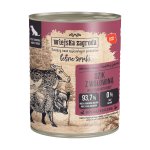 SKŁAD: 53 % mięso z dzika, 15 % wołowina (8 % mięso, 3 % płuca, 3 % wątroba, 2 % nerki), 25,7 % bulion, 4 % jeżyny, 1% składniki mineralne, 0,3 % olej z łososia, 0,2 % suszone drożdże piwne, 0,2 % spirulina, 0,2 % Jukka Mojave, 0,2 % dzika róża, 0,1 % rumianek, 0,06 % glukozamina, 0,04 % siarczan chondroityny.