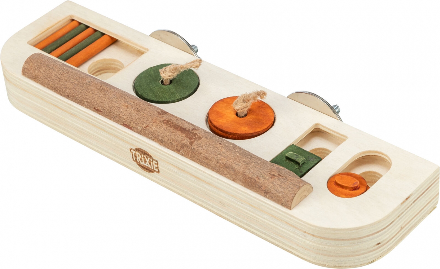 Zabawka składa się z planszy do gry z przesuwanymi drążkami, pokrywami oraz wgłębieniami, gdzie można ukryć smakołyki. Ptak otrzymuje nagrodę poprzez ciągnięcie i pchanie elementów, co angażuje jego umysł i zachęca do aktywnej zabawy.