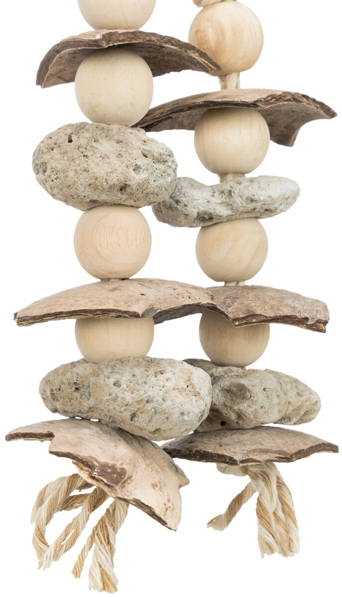 Naturalna zabawka dla ptaków o długości 35 cm, wykonana z kokosa, muszli, skały wulkanicznej i drewna. Idealna do zawieszenia w klatce lub wolierze, zapewnia ptakom zróżnicowaną stymulację sensoryczną oraz fizyczną.
