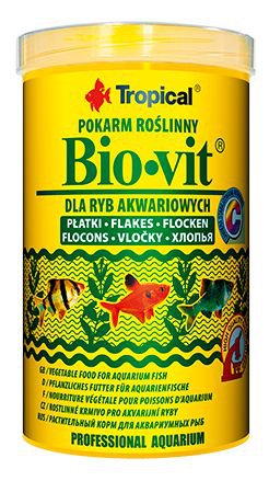 BIO-VIT roślinny pokarm w formie płatków. Płatki BIO-VIT to roślinny pokarm do codziennego karmienia ryb roślinożernych oraz uzupełniający pokarm dla ryb wszystkożernych. Niezastąpiony w akwariach ogólnych z wielogatunkową obsadą ryb. Optymalnie zbilansowany skład oraz dodatek niezbędnych dla ryb witamin i mikroelementów, w tym pochodzących z zarodków pszennych, zapewniają prawidłowy wzrost i rozwój. Na uwagę zasługuje znaczna zawartość stabilizowanej witaminy C, która między innymi wzmacnia odporność ryb na choroby i przyspiesza gojenie się ran i otarć. Regularne karmienie pokarmem BIO-VIT zmniejsza ryzyko zaparć i stanów zapalnych przewodu pokarmowego, na które podatne są szczególnie ryby roślinożerne, mające długie przewody pokarmowe. O tych właściwościach pokarmu decyduje wysoka zawartość substancji balastowych, w tym błonnika, które pobudzają perystaltykę jelit oraz substancje biologicznie czynne obecne w pokrzywie.